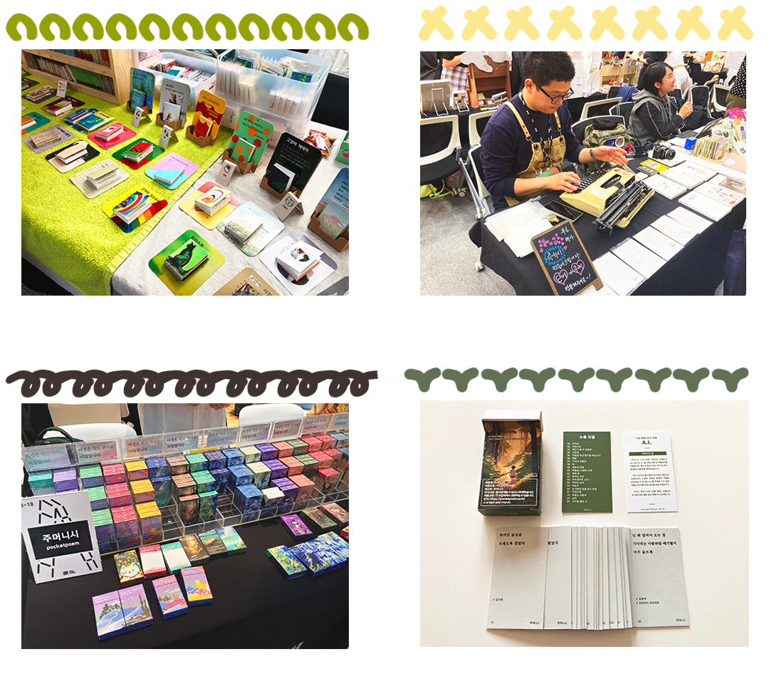 그리고 다른 한편에는 ‘주머니시’라는 곳이 있었는데 스무 장의 시가 적힌 카드를 담뱃갑과 유사하게 만든 상자 안에 넣은 작품을 소개하고 있었어. 담뱃갑처럼 주머니 안에 쏙 넣고 다닐 수 있게 여러 편의 시를 가볍게 볼 수 있도록 만들어진 거지. 제작자의 스토리와 곁들어 들으니 시를 접하는 통로를 이렇게 만들어낸 아이디어와 실행력에 박수를 보내고 싶어졌어. 평소에 시를 접하기 부담스러웠다면 이런 ‘주머니시’로 친근하게 접할 수 있을 것 같아.