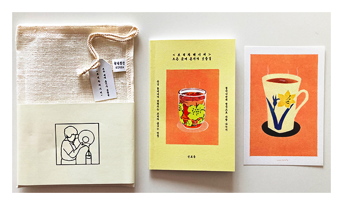 내 발걸음을 멈추게 한 것은 할머니에 대한 기억을 기록한 작품들이었어. 특히 할머니가 매번 끓여주시던 보리차를 주제로 할머니의 보살핌과 사랑을 그려낸 작은 책자에 눈길이 가더라. 〈보리차 레시피 – 모든 곳에 온기가 깃들길〉 에는 보리를 바락바락 정성껏 씻어서 구수한 보리차를 끓여내시는 할머니만의 보리차 끓이는 방법을 소개하고 있어. 할머니가 정성을 담아 끓인 보리차의 구수한 냄새가 소담한 책자를 뚫고 나와 코끝에 닿는 것만 같았어. 그 순간만큼은 늘 찾던 커피 대신 구수하고 따뜻한 보리차 한 잔이 생각났지 뭐야. 할머니의 온기가 그리워지는 작은 책자와 함께 고운 삼베 주머니도 들어 있더라고. 너무 정겨워서 한참을 만지작거리다 보고 싶은 나의 할머니가 생각났어. 소박하지만 항상 맛있는 음식과 간식을 만들어 주시던 나의 할머니. 어릴 때는 할머니가 부엌에서 마술을 부린다고 생각했어. 뚝딱! 하고 맛있는 한상이 차려져 나오던 할머니의 부엌. 자식들과 손주들이 늘 그리워하는 할머니의 밥상. 엄마와 삼촌들의 대화에서 늘 빠지지 않는 ‘할머니의 맛’. 이 〈보리차 레시피〉를 보면서 할머니에 대한 그리움을 함께 느끼고, 떠올릴 수 있었어.