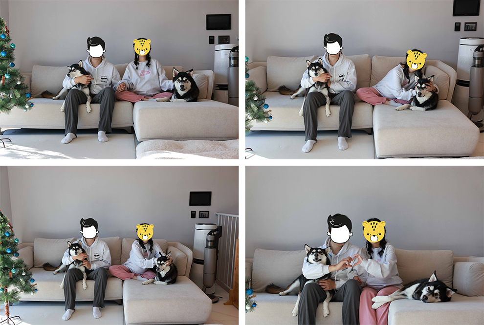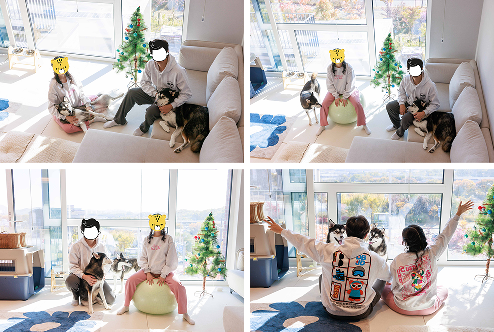 어쨌든, 그리하여 남자이자 어른이자 커다란 카메라를 들고 움직이는 사진 작가님을 콩이 탄이는 영 낯설어했다. 작가님이 “얘들아 우리는 이제 친구야” 얘기하면 콩이 탄이는 “우왕왕왕!(아니야!)” 대답하는 상황이 반복되었는데, 그러는 와중에도 작가님은 프로페셔널하게 우리와 콩이 탄이 사진을 찰칵찰칵 찍어내었다. |